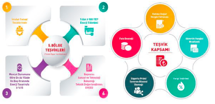 5. Bölge Teşvikleri , bakanlığın vereceği proje onayına istinaden yıllık asgari 500 TEP enerji tüketimi olan mevcut imalat sanayi tesislerinde gerçekleştirilecek mevcut durumuna göre en az %15 oranında enerji tasarrufu sağlayacak şekilde tasarlanan enerji verimlerinin yönelik yatırımlar yapılacağı bölgeye bakılmaksızın beşinci bölgede yapılacak olan yatırımlara sağlanan teşviklerden yararlandırılmasıdır.
